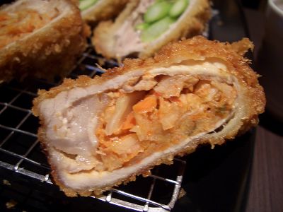 香辣泡菜豬排:精選最嫩且油脂含量少的里肌肉,包裹著香辣泡菜,酥炸而成,外酥內軟,泡菜的香辣口感盡收嘴中,是一道外面吃不到的創意新品喔!