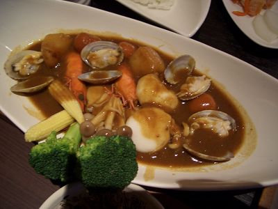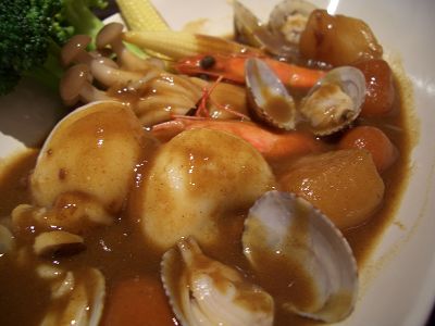 綜合海鮮咖哩:採用花枝、海瓜子、白蝦等新鮮海產,及各式菇類、青花菜等健康食材,搭配香濃咖哩,味道鮮美,絕佳組合。